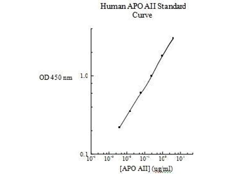 Prepare all reagents, working standards and samples as instructed. Bring all reagents to room temperature before use. The assay is performed at room temperature (20 - 30 °C). Remove excess microplate strips from the plate frame and return them immediately to the foil pouch with desiccant inside. Reseal the pouch securely to minimize exposure to water vapor and store in a vacuum desiccator. Add 50 µL of Apo A-II standard or sample per well. Cover wells with a sealing tape and incubate for two hours. Start the timer after the last sample addition. Wash five times with 200 µL of Wash Buffer. Invert the plate and decant the contents, and hit it 4-5 times on absorbent paper towel to completely remove liquid at each step. Add 50 µL of Biotinylated Apo A-II Antibody to each well and incubate for one hour. Wash five times with 200 µL of Wash Buffer. Invert the plate and decant the contents, and hit it 4-5 times on absorbent paper towel to complete remove liquid at each step. Add 50 µL of Streptavidin-Peroxidase Conjugate to each well and incubate for 30 minutes. Turn on the microplate reader and set up the program in advance. Wash five times with 200 µL of Wash Buffer. Add 50 µL of Chromogen Substrate per well and incubate for about 12 minutes or till the optimal blue color density develops. Gently tap plate to ensure thorough mixing and break the bubbles in the well with pipette tip. Add 50 µL of Stop Solution to each well. The color will change from blue to yellow. Read the absorbance on a microplate reader at a wavelength of 450 nm immediately. Please note that after the reaction is stopped for about 10 minutes, some black particles may be generated at high concentration point, which will reduce the readings. 3