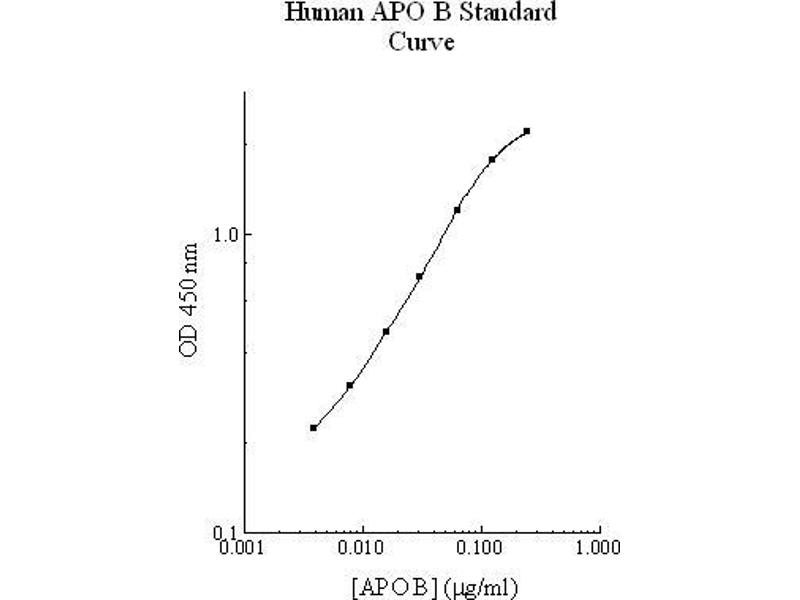 Prepare all reagents, working standards and samples as instructed. Bring all reagents to room temperature before use. The assay is performed at room temperature (20 - 30 °C). Remove excess microplate strips from the plate frame and return them immediately to the foil pouch with desiccant inside. Reseal the pouch securely to minimize exposure to water vapor and store in a vacuum desiccator. Add 50 µL of Apo B standard or sample per well. Cover wells with a sealing tape and incubate for two hours. Start the timer after the last sample addition. Wash five times with 200 µL of Wash Buffer manually. Invert the plate each time and decant the contents, hit it 4-5 times on absorbent paper towel to completely remove the liquid. If using a machine wash six times with 300 µL of Wash Buffer and then invert the plate, decant the contents, hit it 4-5 times on absorbent paper towel to completely remove the liquid. Add 50 µL of Biotinylated Apo B Antibody to each well and incubate for one hour. Wash the microplate as described above. Add 50 µL of Streptavidin-Peroxidase Conjugate to each well and incubate for 30 minutes. Turn on the microplate reader and set up the program in advance. 3 Wash the microplate as described above. Add 50 µL of Chromogen Substrate per well and incubate for about 10 minutes or till the optimal blue color density develops. Gently tap plate to ensure thorough mixing and break the bubbles in the well with pipette tip. Add 50 µL of Stop Solution to each well. The color will change from blue to yellow. Read the absorbance on a microplate reader at a wavelength of 450 nm immediately. If wavelength correction is available, subtract readings at 570 nm from those at 450 nm to correct optical imperfections. Otherwise, read the plate at 450 nm only. Please note that some unstable black particles may be generated at high concentration points after stopping the reaction for about 10 minutes, which will reduce the readings.