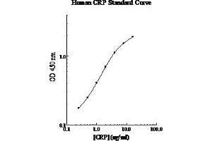 Prepare all reagents, working standards and samples as instructed. Bring all reagents to room temperature before use. The assay is performed at room temperature (20 - 30 °C). Remove excess microplate strips from the plate frame and return them immediately to the foil pouch with desiccant inside. Reseal the pouch securely to minimize exposure to water vapor and store in a vacuum desiccator. Add 50 µL of Standard or sample per well. Cover wells with a sealing tape and incubate for two hours. Start the timer after the last sample addition. Wash five times with 200 µL of Wash Buffer manually. Invert the plate each time and decant the contents, hit it 4-5 times on absorbent paper towel to completely remove the liquid. Add 50 µL of Biotinylated CRP Antibody to each well and incubate for 30 minutes. Wash a microplate as described above. Add 50 µL of Streptavidin-Peroxidase Conjugate per well and incubate for 30 minutes. Turn on the microplate reader and set up the program in advance. Wash a microplate as described above. Add 50 µL of Chromogen Substrate per well and incubate for about 10 minutes or till the optimal color density develops. Gently tap the plate to ensure thorough mixing and break the bubbles in the well with pipette tip. Add 50 µL of Stop Solution to each well. The color will change from blue to yellow. Read the absorbance on a microplate reader at a wavelength of 450 nm immediately. If wavelength correction is available, subtract readings at 570 nm from those at 450 nm to correct optical imperfections. Otherwise, read the plate at 450 nm only. Please note that some unstable black particles may be generated at high concentration points after stopping the reaction for about 10 minutes, which will reduce the readings.