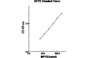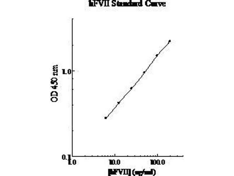 Prepare all reagents, working standards and samples as instructed. Remove excess microplate strips from the plate frame and return them immediately to the foil pouch with desiccant inside. Reseal the pouch securely to minimize exposure to water vapor and store in a vacuum desiccator. Add 50 µL of Standard or sample per well. Cover wells with a sealing tape and incubate for two hours. Start the timer after the last sample addition. Wash five times with 200 µL of Wash Buffer manually. Invert the plate each time and decant the contents, hit it 4-5 times on absorbent paper towel to completely remove the liquid. If using a machine wash six times with 300 µL of Wash Buffer and then invert the plate, decant the contents, hit it 4-5 times on absorbent paper towel to completely remove the liquid. Add 50 µL of Biotinylated FVII Antibody to each well and incubate for one hour. Wash the microplate as described above. Add 50 µL of Streptavidin-Peroxidase Conjugate per well and incubate for 30 minutes. Turn on the microplate reader and set up the program in advance. Wash the microplate as described above. Add 50 µL of Chromogen Substrate per well and incubate for approximately 10 minutes or till the optimal blue color density develop. Gently tap the plate to ensure thorough mixing and break the bubbles in the well with pipette tip. Add 50 µL of Stop Solution to each well. The color will change from blue to yellow. Read the absorbance on a microplate reader at a wavelength of 450 nm immediately. If wavelength correction is available, subtract readings at 570 nm from those at 450 nm to correct optical imperfections. Otherwise, read the plate at 450 nm only. Please note that some unstable black particles may be generated at high concentration points after stopping the reaction for about 10 minutes, which will reduce the readings.