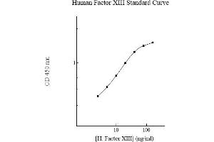 Prepare all reagents, working standards and samples as instructed. Bring all reagents to room temperature before use. The assay is performed at room temperature (20 - 30 °C). Remove excess microplate strips from the plate frame and return them immediately to the foil pouch with desiccant inside. Reseal the pouch securely to minimize exposure to water vapor and store in a vacuum desiccator. Add 50 µL of Standard or sample per well. Cover wells with a sealing tape and incubate for two hours. Start the timer after the last sample addition. Wash five times with 200 µL of Wash Buffer. Invert the plate and decant the contents, and hit the plate 4-5 times on absorbent paper towel to complete remove liquid at each step. Add 50 µL of Biotinylated FxIII Antibody to each well and incubate for 1 hour. Wash five times with 200 µL of Wash Buffer as above. Add 50 µL of Streptavidin-Peroxidase Conjugate per well and incubate for 30 minutes. Turn on the microplate reader and set up the program in advance. Wash five times with 200 µL of Wash Buffer as above. Add 50 µL of Chromogen Substrate per well and incubate for about 10 minutes or till the optimal color density develops. Gently tap the plate to ensure thorough mixing and break the bubbles in the well with pipette tip. Add 50 µL of Stop Solution to each well. The color will change from blue to yellow. Read the absorbance on a microplate reader at a wavelength of 450 nm immediately. Please note that some unstable black particles may be generated at high concentration points after stopping the reaction for about 10 minutes, which will reduce the readings.