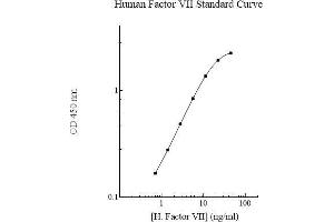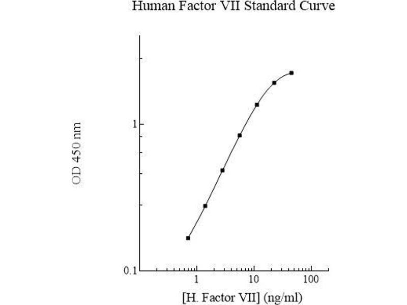 Prepare all reagents, working standards and samples as instructed. Remove excess microplate strips from the plate frame and return them immediately to the foil pouch with desiccant inside. Reseal the pouch securely to minimize exposure to water vapor and store in a vacuum desiccator. Add 50 µL of Standard or sample per well. Cover wells with a sealing tape and incubate for two hours. Start the timer after the last sample addition. Wash five times with 200 µL of Wash Buffer manually. Invert the plate each time and decant the contents, hit it 4-5 times on absorbent paper towel to completely remove the liquid. If using a machine wash six times with 300 µL of Wash Buffer and then invert the plate, decant the contents, hit it 4-5 times on absorbent paper towel to completely remove the liquid. Add 50 µL of Biotinylated FVII Antibody to each well and incubate for one hour. Wash the microplate as described above. Add 50 µL of Streptavidin-Peroxidase Conjugate per well and incubate for 30 minutes. Turn on the microplate reader and set up the program in advance. Wash the microplate as described above. Add 50 µL of Chromogen Substrate per well and incubate for approximately 15 minutes or till the optimal blue color density develop. Gently tap the plate to ensure thorough mixing and break the bubbles in the well with pipette tip. Add 50 µL of Stop Solution to each well. The color will change from blue to yellow. Read the absorbance on a microplate reader at a wavelength of 450 nm immediately. If wavelength correction is available, subtract readings at 570 nm from those at 450 nm to correct optical imperfections. Otherwise, read the plate at 450 nm only. Please note that some unstable black particles may be generated at high concentration points after stopping the reaction for about 10 minutes, which will reduce the readings.