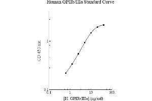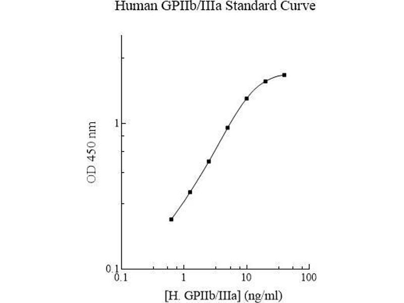 Prepare all reagents, working standards and samples as instructed. Bring all reagents to room temperature before use. The assay is performed at room temperature (20 - 30 °C). Remove excess microplate strips from the plate frame and return them immediately to the foil pouch with desiccant inside. Reseal the pouch securely to minimize exposure to water vapor and store in a vacuum desiccator. Add 50 µL of Standard or sample per well. Cover wells with a sealing tape and incubate for two hours. Start the timer after the last sample addition. Wash five times with 200 µL of Wash Buffer. Invert the plate and decant the contents, and hit the plate 4-5 times on absorbent paper towel to complete remove liquid at each step. Add 50 µL of Biotinylated GPIIb/IIIa Antibody to each well and incubate for 30 minutes. Wash five times with 200 µL of Wash Buffer as above. Add 50 µL of Streptavidin-Peroxidase Conjugate to each well and incubate for 30 minutes. Turn on the microplate reader and set up the program in advance. Wash five times with 200 µL of Wash Buffer as above. Add 50 µL of Chromogen Substrate per well and incubate for about 15 minutes or till the optimal color density develops. Gently tap the plate to ensure thorough mixing and break the bubbles in the well with pipette tip. Add 50 µL of Stop Solution to each well. The color will change from blue to yellow. Read the absorbance on a microplate reader at a wavelength of 450 nm immediately. Please note that some unstable black particles may be generated at high concentration points after stopping the reaction for about 10 minutes, which will reduce the readings.