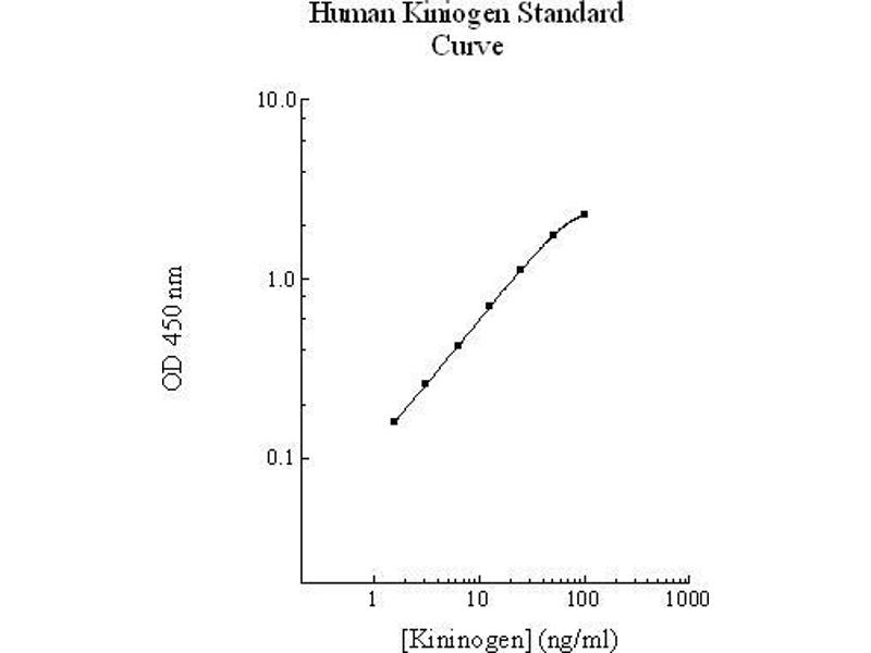 Prepare all reagents, working standards and samples as instructed. Bring all reagents to room temperature before use. The assay is performed at room temperature (20 - 30 °C). Remove excess microplate strips from the plate frame and return them immediately to the foil pouch with desiccant inside. Reseal the pouch securely to minimize exposure to water vapor and store in a vacuum desiccator. Add 50 µL of Kininogen standard or sample per well. Cover wells with a sealing tape and incubate for two hours. Start the timer after the last sample addition. Wash five times with 200 µL of Wash Buffer. Invert the plate and decant the contents, and hit it 4-5 times on absorbent paper towel to completely remove liquid at each step. Add 50 µL of Biotinylated Kininogen Antibody to each well and incubate for one hour. Wash five times with 200 µL of Wash Buffer. Invert the plate and decant the contents, and hit it 4-5 times on absorbent paper towel to complete remove liquid at each step. Add 50 µL of Streptavidin-Peroxidase Conjugate to each well and incubate for 30 minutes. Turn on the microplate reader and set up the program in advance. Wash five times with 200 µL of Wash Buffer. Add 50 µL of Chromogen Substrate per well and incubate for about 10 minutes or till the optimal blue color density develops. Gently tap plate to ensure thorough mixing and break the bubbles in the well with pipette tip. Add 50 µL of Stop Solution to each well. The color will change from blue to yellow. Read the absorbance on a microplate reader at a wavelength of 450 nm immediately. Please note that after the reaction is stopped for about 10 minutes, some black particles may be generated at high concentration point, which will reduce the readings.