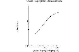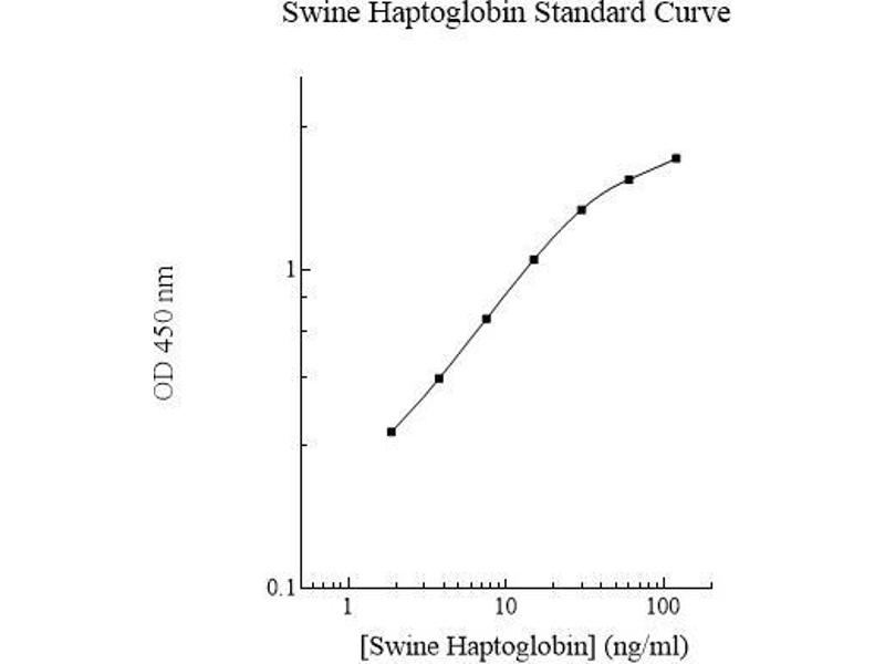 Prepare all reagents, standard solutions, and samples as instructed. Bring all reagents to room temperature before use. The assay is performed at room temperature (20-25 °C). Remove excess microplate strips from the plate frame and return them immediately to the foil pouch with desiccants inside. Reseal the pouch securely to minimize exposure to water vapor and store in a vacuum desiccator. Add 50 l of Swine Haptoglobin Standard or sample per well. Gently tap plate to thoroughly coat the wells. Break any bubbles that may have formed. Cover wells with a sealing tape and incubate for 2 hours. Start the timer after the last addition. Wash five times with 200 l of Wash Buffer manually. Invert the plate each time and decant the contents, hit 4-5 times on absorbent material to completely remove the liquid. If using a machine, wash six times with 300 l of Wash Buffer and then invert the plate, decanting the contents, hit 4-5 times on absorbent material to completely remove the liquid. Add 50 l of Biotinylated Swine Haptoglobin Antibody to each well. Gently tap plate to thoroughly coat the wells. Break any bubbles that may have formed. Cover wells with a sealing tape and incubate for 1 hour. Wash the microplate as described above. Add 50 l of Streptavidin-Peroxidase Conjugate per well. Gently tap plate to thoroughly coat the wells. Break any bubbles that may have formed. Cover wells with a sealing tape and incubate for 30 minutes. Turn on the microplate reader and set up the program in advance. Wash the microplate as described above. Add 50 l of Chromogen Substrate per well. Gently tap plate to thoroughly coat the wells. Break any bubbles that may have formed. Incubate for 15 minutes or till the optimal blue color density develops. Add 50 l of Stop Solution to each well. The color will change from blue to yellow. Gently tap plate to ensure thorough mixing. Break any bubbles that may have formed. Read the absorbance on a microplate reader at a wavelength of 450 nm immediately. If wavelength correction is available, subtract readings at 570 nm from those at 450 nm to correct optical imperfections. Otherwise, read the plate at 450 nm only. Please note that some unstable black particles may be generated at high concentration points after stopping the reaction for about 10 minutes, which will reduce the readings. 6