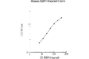 Prepare all reagents, working standards and samples as instructed. Bring all reagents to room temperature before use. The assay is performed at room temperature (20 - 30 °C). Remove excess microplate strips from the plate frame and return them immediately to the foil pouch with desiccant inside. Reseal the pouch securely to minimize exposure to water vapor and store in a vacuum desiccator. Add 50 µL of Standard or sample per well. Cover wells with a sealing tape and incubate for two hours. Start the timer after the last sample addition. Wash five times with 200 µL of Wash Buffer manually. Invert the plate each time and decant the contents, hit it 4-5 times on absorbent paper towel to completely remove the liquid. Add 50 µL of Biotinylated RBP 4 Antibody to each well and incubate for one hour. Wash a microplate as described above. 3 Add 50 µL of Streptavidin-Peroxidase Conjugate per well and incubate for 30 minutes. Turn on the microplate reader and set up the program in advance. Wash a microplate as described above. Add 50 µL of Chromogen Substrate per well and incubate for about 10 minutes or till the optimal blue color density develops. Gently tap plate to ensure thorough mixing and break the bubbles in the well with pipette tip. Add 50 µL of Stop Solution to each well. The color will change from blue to yellow. Read the absorbance on a microplate reader at a wavelength of 450 nm immediately. If wavelength correction is available, subtract readings at 570 nm from those at 450 nm to correct optical imperfections. Otherwise, read the plate at 450 nm only. Please note that some unstable black particles may be generated at high concentration points after stopping the reaction for about 10 minutes, which will reduce the readings.