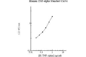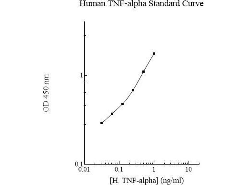 Prepare all reagents, working standards and samples as instructed. Bring all reagents to room temperature before use. The assay is performed at room temperature (20 - 30 °C). Remove excess microplate strips from the plate frame and return them immediately to the foil pouch with desiccant inside. Reseal the pouch securely to minimize exposure to water vapor and store in a vacuum desiccator. Add 50 µL of Standard or sample per well. Cover wells and incubate for two hours. Start the timer after the last sample addition. Wash five times with 200 µL of Wash Buffer. Invert the plate and decant the contents, and hit it 4-5 times on absorbent paper towel to complete remove liquid at each step. Add 50 µL of Biotinylated TNF-alpha Antibody to each well and incubate for two hours. Wash five times with 200 µL of Wash Buffer as above. Add 50 µL of Streptavidin-Peroxidase Conjugate per well and incubate for 30 minutes. Turn on the microplate reader and set up the program in advance. Wash five times with 200 µL of Wash Buffer as above. Add 50 µL of Chromogen Substrate per well and incubate for approximately 12 minutes or till the optimal blue color density develops. Gently tap the plate to ensure thorough mixing and break the bubbles in the well with pipette tip. Add 50 µL of Stop Solution to each well. The color will change from blue to yellow. Read the absorbance on a microplate reader at a wavelength of 450 nm immediately. Please note that some unstable black particles may be generated at high concentration points after stopping the reaction for about 10 minutes, which will reduce the readings. 3
