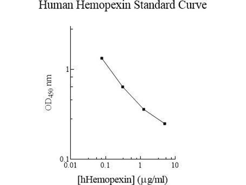 Prepare all reagents, working standards and samples as instructed. Bring all reagents to room temperature before use. The assay is performed at room temperature (20 - 30 °C). Remove excess microplate strips from the plate frame and return them immediately to the foil pouch with desiccant inside. Reseal the pouch securely to minimize exposure to water vapor and store in a vacuum desiccator. Add 25 µL of standard or sample per well, and immediately add 25 µL of Biotinylated Hemopexin to each well (on top of the Standard or sample) and mix gently. Cover wells with a sealing tape and incubate for one hour. Start the timer after the last sample addition. Wash five times with 200 µL of Wash Buffer. Invert the plate and decant the contents, and hit it 4-5 times on absorbent paper towel to complete remove liquid at each step. Add 50 µL of Streptavidin-Peroxidase Conjugate to each well and incubate for 30 minutes. Turn on the microplate reader and set up the program in advance. Wash five times with 200 µL of Wash Buffer. Add 50 µL of Chromogen Substrate per well and incubate for about 10 minutes or till the optimal blue color density develops. Gently tap plate to ensure thorough mixing and break the bubbles in the well with pipette tip. Add 50 µL of Stop Solution to each well. The color will change from blue to yellow. Read the absorbance on a microplate reader at a wavelength of 450 nm immediately. Please note that after the reaction is stopped for about 10 minutes, some black particles may be generated at high concentration point, which will reduce the readings.