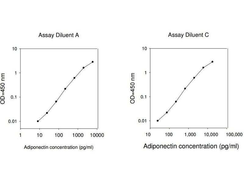 Typical Data: These standard curves are for demonstration only. A standard curve must be run with each assay. Assay Diluent A Adiponectin concentration (pg/mL) 1 10 100 1000 10000 O D =4 50 n m 0.01 0.1 1 10 Assay Diluent C Adiponectin concentration (pg/mL) O D =4 50 n m 0.01 0.1 1 10 10 100 1,000 10,000 100,000