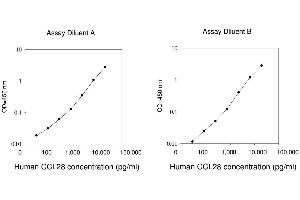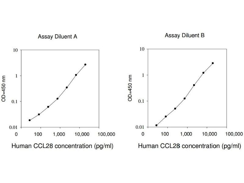 Typical Data: These standard curves are for demonstration only. A standard curve must be run with each assay. Assay Diluent A Human CCL28 concentration (pg/mL) O D =4 50 n m 0.01 0.1 1 10 0 100 1,000 10,000 100,000 Assay Diluent B Human CCL28 concentration (pg/mL) O D =4 50 n m 0.01 0.1 1 10 0 100 1,000 10,000 100,000