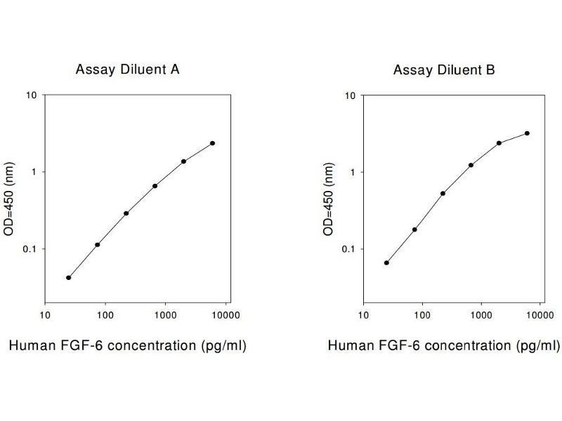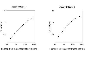 Typical Data: These standard curves are for demonstration only. A standard curve must be run with each assay. Assay Diluent A Human FGF-6 concentration (pg/mL) 10 100 1000 10000 O D =4 50 (n m ) 0.1 1 10 Assay Diluent B Human FGF-6 concentration (pg/mL) 10 100 1000 10000 O D =4 50 (n m ) 0.1 1 10