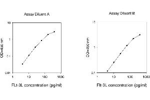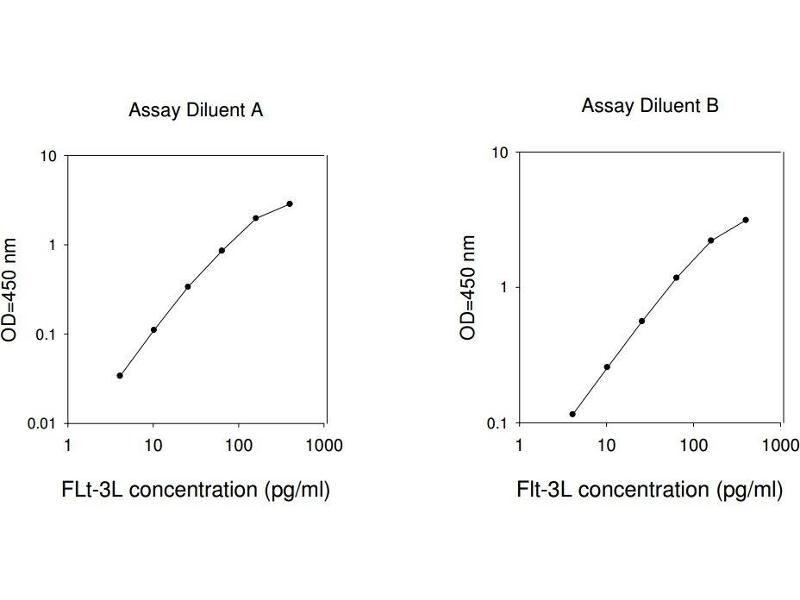 Typical Data: These standard curves are for demonstration only. A standard curve must be run with each assay. Assay Diluent A FLt-3L concentration (pg/mL) 1 10 100 1000 O D =4 50 n m 0.01 0.1 1 10 Assay Diluent B Flt-3L concentration (pg/mL) 1 10 100 1000 O D =4 50 n m 0.1 1 10