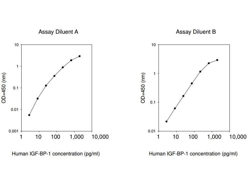Typical Data: These standard curves are for demonstration only. A standard curve must be run with each assay. Assay Diluent A Human IGF-BP-1 concentration (pg/mL) O D =4 50 (n m ) 0.001 0.01 0.1 1 10 1 10 100 1,000 10,000 Assay Diluent B Human IGF-BP-1 concentration (pg/mL) O D =4 50 (n m ) 0.01 0.1 1 10 1 10 100 1,000 10,000