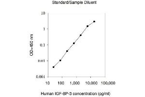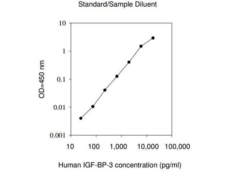 - The Human IGFBP-3 ELISA (Enzyme-Linked mmunosorbent Assay) kit is an in vitro enzyme-linked immunosorbent assay for the quantitative measurement of human IGFBP-3 in serum, plasma, cell culture supernatants and urine. This assay employs an antibody specific for human IGFBP-3 coated on a 96-well plate. Standards and samples are pipetted into the wells and IGFBP-3 present in a sample is bound to the wells by the immobilized antibody. The wells are washed and biotinylated anti-human IGFBP-3 antibody is added. After washing away unbound biotinylated antibody, HRP-conjugated streptavidin is pipetted to the wells. The wells are again washed, a TMB substrate solution is added to the wells and color develops in proportion to the amount of IGFBP-3 bound. The Stop Solution changes the color from blue to yellow, and the intensity of the color is measured at 450 nm. Reproducibility: Intra-Assay: CV<10% Inter-Assay: CV<12%.