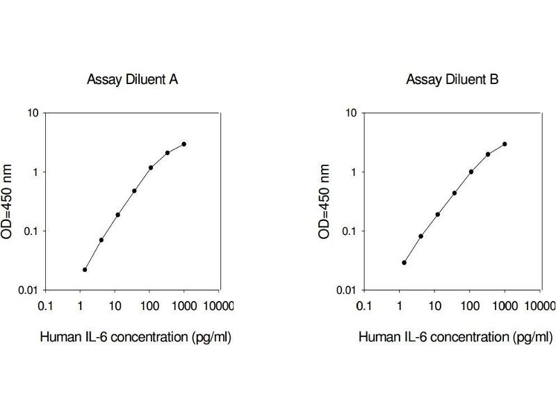 Typical Data: These standard curves are for demonstration only. A standard curve must be run with each assay. Assay Diluent A Human IL-6 concentration (pg/mL) 0.1 1 10 100 1000 10000 O D =4 50 n m 0.01 0.1 1 10 Assay Diluent B Human IL-6 concentration (pg/mL) 0.1 1 10 100 1000 10000 O D =4 50 n m 0.01 0.1 1 10