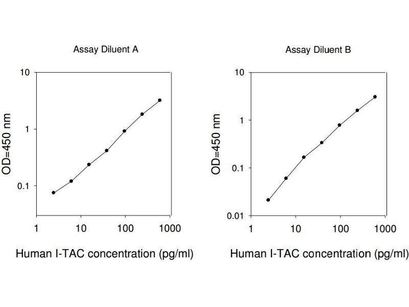 - Bring all reagents and samples to room temperature (18 - 25°C) before use. 2. Sample dilution: If your samples need to be diluted, Assay Diluent A (Item D) is used for dilution of serum/plasma samples, and Assay Diluent B (Item E) is used for dilution of culture supernates and urine. 3. Assay Diluent B should be diluted 5-fold with deionized or distilled water. 4. Preparation of standard: Briefly spin the vial of Item C and then add 400 µl Assay Diluent A (for serum/plasma samples) or 1x Assay Diluent B (for cell culture medium and urine, Assay Diluent B should be diluted 5-fold with deionized or distilled water) into Item C vial to prepare a 50 ng/ml standard. Dissolve the powder thoroughly by a gentle mix. Add 8 µl I-TAC standard from the vial of Item C, into a tube with 658.7 µl Assay Diluent A or 1x Assay Diluent B to prepare a 600 pg/ml stock standard solution. Pipette 300 µl Assay Diluent A or 1x Assay Diluent B into each tube. Use the stock standard solution to produce a dilution series (shown below). Mix each tube thoroughly before the next transfer. Assay Diluent A or 1x Assay Diluent B serves as the zero standard (0 pg/ml). 5. If the Wash Concentrate (20x) (Item B) contains visible crystals, warm to room temperature and mix gently until dissolved. Dilute 20 ml of Wash Buffer Concentrate into deionized or distilled water to yield 400 ml of 1x Wash Buffer. 6. Briefly spin the Detection Antibody vial (Item F) before use. Add 100 µl of 1x Assay Diluent B into the vial to prepare a detection antibody concentrate. Pipette up and down to mix gently (the concentrate can be stored at 4°C for 5 days). The detection antibody concentrate should be diluted 80-fold with 1x Assay Diluent B and used in step 4 of Part VI Assay Procedure. 7. Briefly spin the HRP-Streptavidin concentrate vial (Item G) and pipette up and down to mix gently before use. HRP- Streptavidin concentrate should be diluted 10,000-fold with 1x Assay Diluent B. For example: Briefly spin the vial (Item G) and pipette up and down to mix gently . Add 2 µl of HRP-Streptavidin concentrate into a tube with 198.0 µl 1x Assay Diluent B to prepare a 100-fold diluted HRP- Streptavidin solution (do not store the diluted solution for next day use). Mix through and then pipette 120 µl of prepared 100-fold diluted solution into a tube with 12 ml 1x Assay Diluent B to prepare a final 10,000 fold diluted HRP-Streptavidin solution.