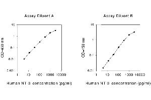 - The Human NT-3 ELISA (Enzyme-Linked Immunosorbent Assay) kit is an in vitro enzyme-linked immunosorbent assay for the quantitative measurement of human NT-3 in serum, plasma, cell culture supernatants and urine. This assay employs an antibody specific for human NT-3 coated on a 96-well plate. Standards and samples are pipetted into the wells and NT-3 present in a sample is bound to the wells by the immobilized antibody. The wells are washed and biotinylated anti-human NT-3 antibody is added. After washing away unbound biotinylated antibody, HRP-conjugated streptavidin is pipetted to the wells. The wells are again washed, a TMB substrate solution is added to the wells and color develops in proportion to the amount of NT-3 bound. The Stop Solution changes the color from blue to yellow, and the intensity of the color is measured at 450 nm. Reproducibility: Intra-Assay: CV<10% Inter-Assay: CV<12%.