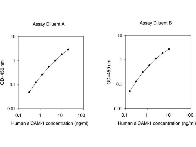 Typical Data: These standard curves are for demonstration only. A standard curve must be run with each assay. Assay Diluent A Human sICAM-1 concentration (ng/mL) O D =4 50 n m 0.01 0.1 1 10 0.1 1 10 100 Assay Diluent B Human sICAM-1 concentration (ng/mL) O D =4 50 n m 0.01 0.1 1 10 0.1 1 10 100