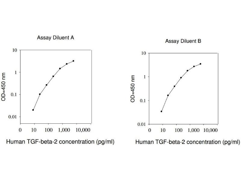 Typical Data: These standard curves are for demonstration only. A standard curve must be run with each assay. Assay Diluent A Human TGF-beta-2 concentration (pg/mL) O D =4 50 n m 0.01 0.1 1 10 0 10 100 1,000 10,000 Assay Diluent B Human TGF-beta-2 concentration (pg/mL) O D =4 50 n m 0.01 0.1 1 10 0 10 100 1,000 10,000