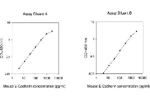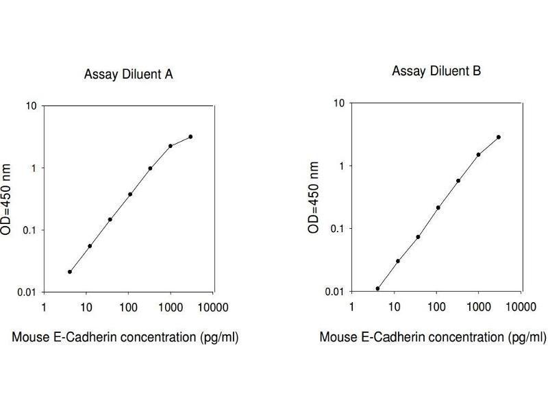 Typical Data: These standard curves are for demonstration only. A standard curve must be run with each assay. Assay Diluent A Mouse E-Cadherin concentration (pg/mL) 1 10 100 1000 10000 O D =4 50 n m 0.01 0.1 1 10 Assay Diluent B Mouse E-Cadherin concentration (pg/mL) 1 10 100 1000 10000 O D =4 50 n m 0.01 0.1 1 10