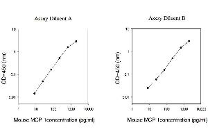 Typical Data: These standard curves are for demonstration only. A standard curve must be run with each assay. Assay Diluent A Mouse MCP-1concentration (pg/mL) 1 10 100 1000 10000 O D =4 50 (n m ) 0.01 0.1 1 10 Assay Diluent B Mouse MCP-1concentration (pg/mL) 1 10 100 1000 10000 O D =4 50 (n m ) 0.01 0.1 1 10
