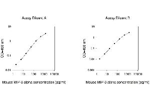 Typical Data: These standard curves are for demonstration only. A standard curve must be run with each assay. Assay Diluent A Mouse MIP-3 alpha concentration (pg/mL) 1 10 100 1000 10000 O D =4 50 n m 0.01 0.1 1 10 Assay Diluent B Mouse MIP-3 alpha concentration (pg/mL) 1 10 100 1000 10000 O D =4 50 n m 0.001 0.01 0.1 1 10