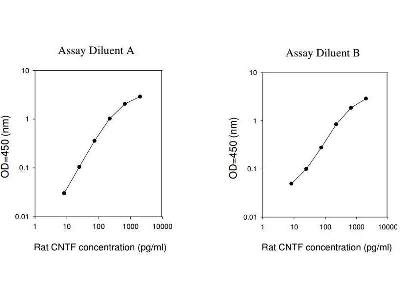 Typical Data: These standard curves are for demonstration only. A standard curve must be run with each assay. Assay Diluent A Rat CNTF concentration (pg/mL) 1 10 100 1000 10000 O D =4 50 (n m ) 0.01 0.1 1 10 Assay Diluent B Rat CNTF concentration (pg/mL) 1 10 100 1000 10000 O D =4 50 (n m ) 0.01 0.1 1 10