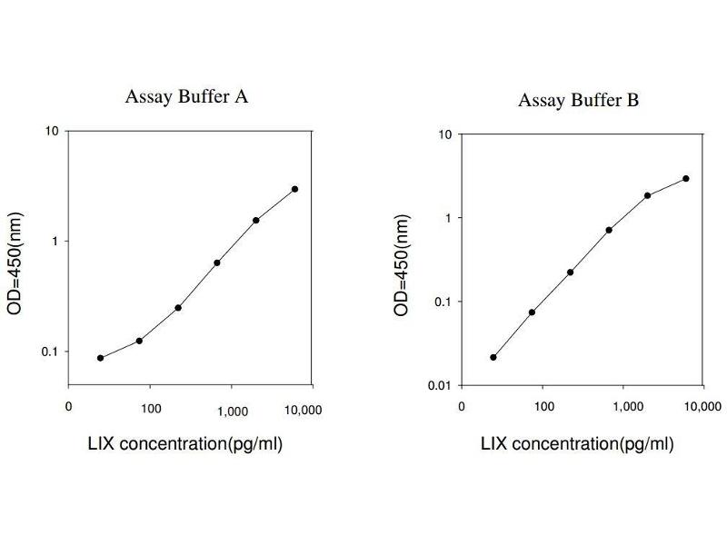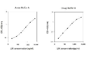 Typical Data: These standard curves are for demonstration only. A standard curve must be run with each assay. Assay Buffer A LIX concentration(pg/mL) O D =4 50 (n m ) 0.1 1 10 100 1,000 10,0000 Assay Buffer B LIX concentration(pg/mL) O D =4 50 (n m ) 0.01 0.1 1 10 100 1,000 10,0000