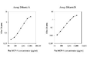 Typical Data: These standard curves are for demonstration only. A standard curve must be run with each assay. Assay Diluent A Rat MCP-1 concentration (pg/mL) O D =4 50 (n m ) 0.01 0.1 1 10 10 100 1,000 10,000 100,000 Assay Diluent B Rat MCP-1 concentration (pg/mL) O D =4 50 (n m ) 0.001 0.01 0.1 1 10 10 100 1,000 10,000 100,000