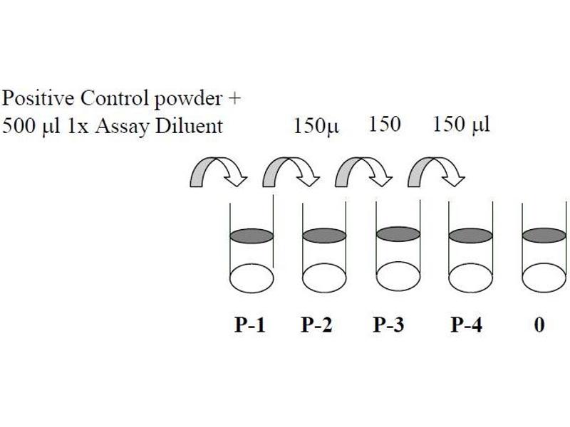 3. Preparation of Positive Control: Briefly spin the Positive Control vial of Item K. Add 500 µL 1x Assay Diluent (Item E, Assay Diluent should be diluted 5-fold with deionized or distilled water before use) into Item K vial to prepare Positive Control (1) Solution (See i. Positive Control of part IX.for a typical result in page 9). Dissolve the powder thoroughly by a gentle mix (it can be removed by centrifuge if any precipitate in the solution is found). Pipette 300 µL 1x Assay Diluent into each tube. Use the Positive Control (1) to produce a dilution series (shown below). Mix each tube thoroughly before the next transfer. 1x Assay Diluent serves as the background. Phospho-Akt (Ser473) ELISA Kit Protocol 6