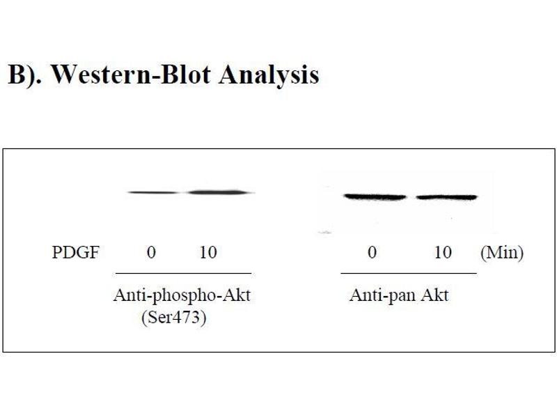 ii. Recombinant Human PDGF Stimulation of NIH3T3 Cell Lines NIH3T3 cells were treated or untreated with recombinant human PDGF for 10 min. Cell lysates were analyzed using this phosphoELISA and Western Blot. A). ELISA Phospho-Akt (Ser473) Pan Akt O D =4 50 n m 0.0 0.5 1.0 1.5 2.0 2.5 3.0 NIH3T3 NIH3T3+PDGF B). Western-Blot Analysis PDGF 0 10 0 10 (Min) Anti-phospho-Akt Anti-pan Akt (Ser473) Phospho-Akt (Ser473) ELISA Kit Protocol 11
