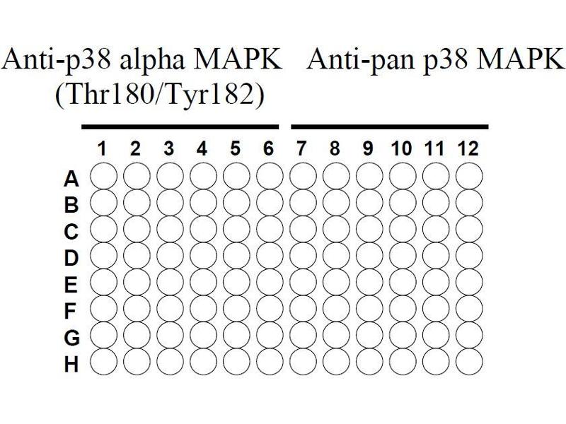 - Bring all reagents to room temperature (18 - 25 °C) before use. It is recommended that all samples or Positive Control should be run at least in duplicate. Add 100 µL of each sample or positive control into appropriate wells (see the following 96 well microplate formate). Cover Phospho-P38 alpha MAPK (Thr180/Tyr182) and pan P38 alpha MAPK ELISA Kit Protocol 8 well with plate holder and incubate for 2.5 hours at room temperature or over night at 4 °C with shaking. 96 well microplate coated with phosphorylated and pan antibodies: Anti-p38 alpha MAPK Anti-pan p38 MAPK (Thr180/Tyr182)