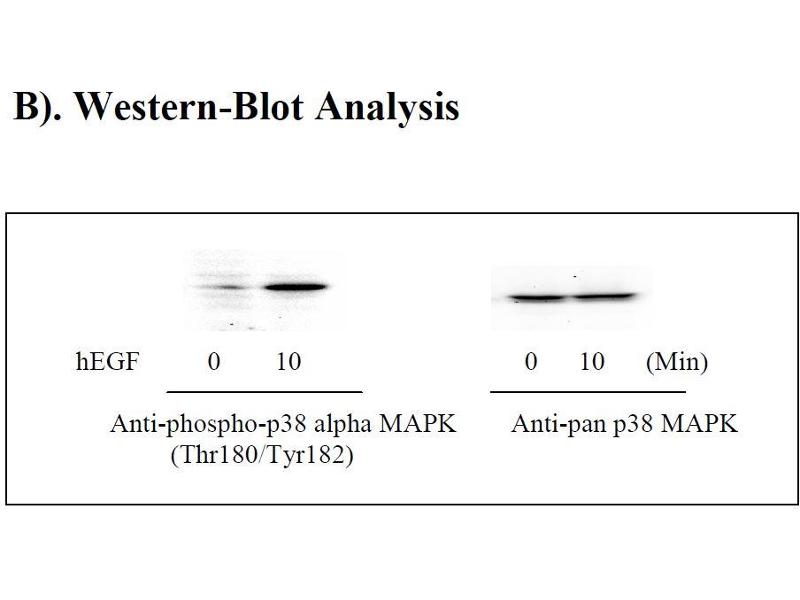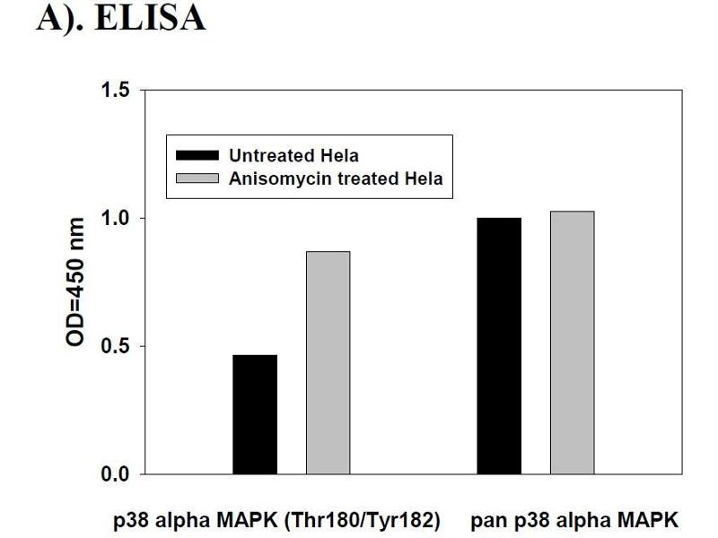 ii. Anisomycin Stimulation of Hela Cell Lines Hela cells were treated or untreated with Anisomycin for 10 min at 37 °C. Cell lysates were analyzed using this phosphoELISA and Western Blot. A). ELISA p38 alpha MAPK (Thr180/Tyr182) pan p38 alpha MAPK O D =4 50 n m 0.0 0.5 1.0 1.5 Untreated Hela Anisomycin treated Hela B). Western-Blot Analysis hEGF 0 10 0 10 (Min) Anti-phospho-p38 alpha MAPK Anti-pan p38 MAPK (Thr180/Tyr182) Phospho-P38 alpha MAPK (Thr180/Tyr182) and pan P38 alpha MAPK ELISA Kit Protocol 12 X -