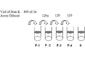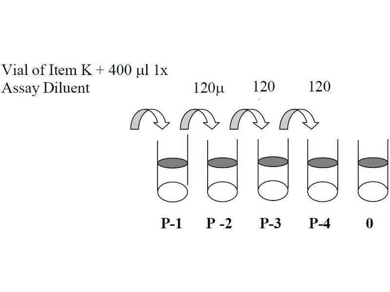 3. Preparation of Positive Control: Briefly spin the Positive Control vial of Item K. Add 400 µL 1x Assay Diluent (Item E, Assay Diluent should be diluted 5-fold with deionized or distilled water before use) into Item K vial to prepare a Positive Control (P-1) Solution. Dissolve the powder thoroughly by a gentle mix (it can be removed by centrifuge if any precipitate in the solution is found. See i. Positive Control of part IX.for a typical result in page 9). Pipette 240 µL 1x Assay Diluent into each tube. Use the Positive Control (P-1) to produce a dilution series (shown below). Mix each tube thoroughly before the next transfer. 1x Assay Diluent serves as the background.
