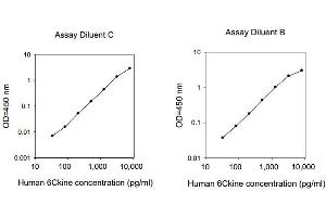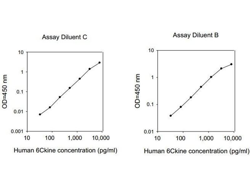 - This assay employs an antibody specific for human 6Ckine coated on a 96-well plate. Standards and samples are pipetted into the wells and 6Ckine present in a sample is bound to the wells by the immobilized antibody. The wells are washed and biotinylated anti-human 6Ckine antibody is added. After washing away unbound biotinylated antibody, HRP-conjugated streptavidin is pipetted to the wells. The wells are again washed, a TMB substrate solution is added to the wells and color develops in proportion to the amount of 6Ckine bound. The Stop Solution changes the color from blue to yellow, and the intensity of the color is measured at 450 nm. Reproducibility: Intra-Assay: CV<10% Inter-Assay: CV<12%.