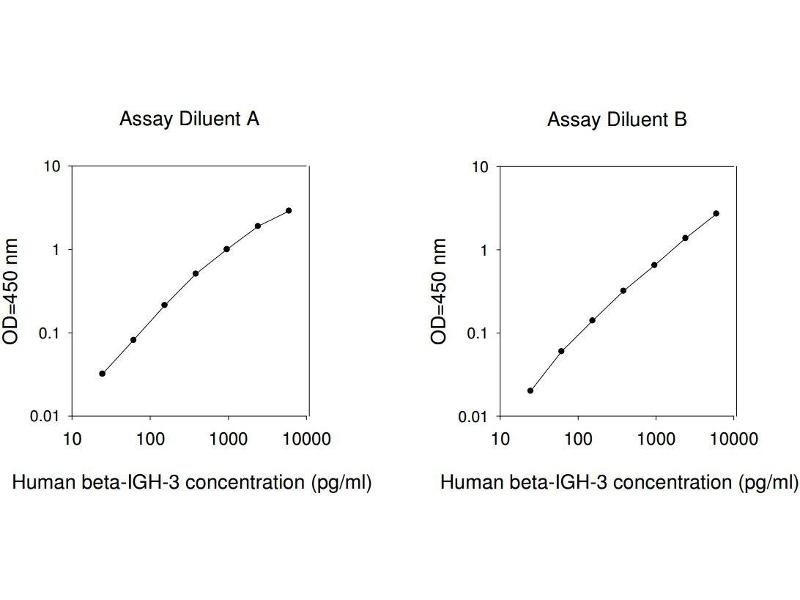 Typical Data: These standard curves are for demonstration only. A standard curve must be run with each assay. Assay Diluent A Human beta-IGH-3 concentration (pg/mL) 10 100 1000 10000 O D =4 50 n m 0.01 0.1 1 10 Assay Diluent B Human beta-IGH-3 concentration (pg/mL) 10 100 1000 10000 O D =4 50 n m 0.01 0.1 1 10