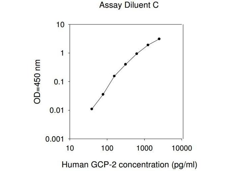 1. Bring all reagents and samples to room temperature (18 - 25°C) before use. 2. Sample dilution: If your samples need to be diluted, Assay Diluent C (Item L) is used for dilution of serum/plasma/culture supernatants/urine. 3. Assay Diluent B (Item E) should be diluted 5-fold with deionized or distilled water before use. 4. Preparation of standard: Briefly spin the vial of Item C. Add 400 µl Assay Diluent C (Item L) into Item C vial to prepare a 100 ng/ml standard solution. Dissolve the powder thoroughly by a gentle mix. Add 20 µl GCP-2 standard from the vial of Item C, into a tube with 780 µl Assay Diluent C to prepare a 2,500 pg/ml standard solution. Pipette 300 µl Assay Diluent C into each tube. Use the 2,500 pg/ml standard solution to produce a dilution series (shown below). Mix each tube thoroughly before the next transfer. Gently vortex to mix. Assay Diluent C serves as the zero standard (0 pg/ml). 5. If the Wash Concentrate (20x) (Item B) contains visible crystals, warm to room temperature and mix gently until dissolved. Dilute 20 ml of Wash Buffer Concentrate into deionized or distilled water to yield 400 ml of 1x Wash Buffer. 6. Briefly spin the Detection Antibody vial (Item F) before use. Add 100 µl of 1x Assay Diluent B (Item E) into the vial to prepare a detection antibody concentrate. Pipette up and down to mix gently (the concentrate can be stored at 4°C for 5 days). The detection antibody concentrate should be diluted 80-fold with 1x Assay Diluent B and used in step 4 of Part VI Assay Procedure. 7. Briefly spin the HRP-Streptavidin concentrate vial (Item G) and pipette up and down to mix gently before use. HRP-Streptavidin concentrate should be diluted 25,000-fold with 1x Assay Diluent B (Item E). For example: Briefly spin the vial (Item G) and pipette up and down to mix gently . Add 2 µl of HRP-Streptavidin concentrate into a tube with 198.0 µl 1x Assay Diluent B to prepare a 100-fold diluted HRP-Streptavidin solution (do not store the diluted solution for next day use). Mix through and then pipette 40 µl of prepared 100-fold diluted solution into a tube with 10 ml 1x Assay Diluent B to prepare a final 25,000 fold diluted HRP-Streptavidin solution.