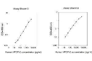 - Bring all reagents and samples to room temperature (18 - 25°C) before use. 2. Sample dilution: Assay Diluent C (Item L) is used for dilution of serum/plasma samples, 1x Assay Diluent B (Item E) can be used for dilution of cell culture supernates/urine. 3. Assay Diluent B should be diluted 5-fold with deionized or distilled water before use. 4. Preparation of standard: Briefly spin the vial of Item C and then add 400 µl Assay Diluent C (for serum/plasma samples) or 1x Assay Diluent B (for cell culture supernates/urine) into Item C vial to prepare a 100 ng/ml standard. Dissolve the powder thoroughly by a gentle mix. Add 50 µl VEGF-C standard (100 ng/ml) from the vial of Item C, into a tube with 450 µl Assay Diluent C or 1x Assay Diluent B to prepare a 10,000 pg/ml standard solution. Pipette 400 µl Assay Diluent C or 1x Assay Diluent B into each tube. Use the 10,000 pg/ml standard solution to produce a dilution series (shown below). Mix each tube thoroughly before the next transfer. Gently vortex to mix. Assay Diluent C or 1x Assay Diluent B serves as the zero standard (0 pg/ml). 5. If the Wash Concentrate (20x) (Item B) contains visible crystals, warm to room temperature and mix gently until dissolved. Dilute 20 ml of Wash Buffer Concentrate into deionized or distilled water to yield 400 ml of 1x Wash Buffer. 6. Briefly spin the Detection Antibody vial (Item F) before use. Add 100 µl of 1x Assay Diluent B into the vial to prepare a detection antibody concentrate. Pipette up and down to mix gently (the concentrate can be stored at 4°C for 5 days). The detection antibody concentrate should be diluted 80-fold with 1x Assay Diluent B and used in step 4 of Part VI Assay Procedure. 7. Briefly spin the HRP-Streptavidin concentrate vial (Item G) and pipette up and down to mix gently before use. HRP-Streptavidin concentrate should be diluted 10,000-fold with 1x Assay Diluent B. For example: Briefly spin the vial (Item G) and pipette up and down to mix gently . Add 2 µl of HRP-Streptavidin concentrate into a tube with 198 µl 1x Assay Diluent B to prepare a 100-fold diluted HRP- Streptavidin solution (do not store the diluted solution for next day use). Mix through and then pipette 100 µl of prepared 100-fold diluted solution into a tube with 10 ml 1x Assay Diluent B to prepare a final 10,000 fold diluted HRP-Streptavidin solution.