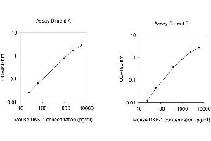 Typical Data: These standard curves are for demonstration only. A standard curve must be run with each assay. Assay Diluent A Mouse DKK-1 concentration (pg/mL) 10 100 1000 10000 O D =4 50 n m 0.01 0.1 1 10 Assay Diluent B Mouse DKK-1 concentration (pg/mL) 10 100 1000 10000 O D =4 50 n m 0.01 0.1 1 10