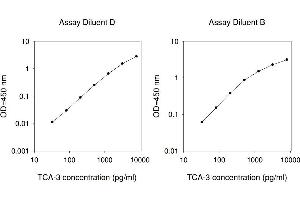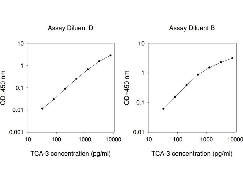 1. Bring all reagents and samples to room temperature (18 - 25°C) before use. 2. Sample dilution: 1x Assay Diluent D (Item K) is used for dilution of serum/plasma samples, 1x Assay Diluent B (Item E) can be used for dilution of cell culture supernates. If your samples need to be diluted, 1x Assay Diluent D (Item K) should be used for dilution of serum/plasma samples. 1x Assay Diluent B (Item E) should be used for dilution of cell culture supernatants and urine. Suggested dilution for normal serum/plasma: 2-fold*. 3. Assay Diluent B and Assay Diluent D should be diluted 5-fold with deionized or distilled water before use. 4. Preparation of standard: Briefly spin the vial of Item C and then add 400 µl 1x Assay Diluent D (for serum/plasma samples) or 1x Assay Diluent B (for cell culture supernates) into Item C vial to prepare a 50 ng/ml standard. Dissolve the powder thoroughly by a gentle mix. Add 80 µl TCA-3 standard (50 ng/ml) from the vial of Item C, into a tube with 420 µl 1x Assay Diluent D or 1x Assay Diluent B to prepare a 8,000 pg/ml standard solution. Pipette 300 µl 1x Assay Diluent D or 1x Assay Diluent B into each tube. Use the 8,000 pg/ml standard solution to produce a dilution series (shown below). Mix each tube thoroughly before the next transfer. Gently vortex to mix. 1x Assay Diluent D or 1x Assay Diluent B serves as the zero standard (0 pg/ml). 5. If the Wash Concentrate (20x) (Item B) contains visible crystals, warm to room temperature and mix gently until dissolved. Dilute 20 ml of Wash Buffer Concentrate into deionized or distilled water to yield 400 ml of 1x Wash Buffer. 6. Briefly spin the Detection Antibody vial (Item F) before use. Add 100 µl of 1x Assay Diluent B into the vial to prepare a detection antibody concentrate. Pipette up and down to mix gently (the concentrate can be stored at 4°C for 5 days). The detection antibody concentrate should be diluted 80-fold with 1x Assay Diluent B and used in step 4 of Part VI Assay Procedure. 7. Briefly spin the HRP-Streptavidin concentrate vial (Item G) and pipette up and down to mix gently before use. HRP-Streptavidin concentrate should be diluted 35,000-fold with 1x Assay Diluent B. For example: Briefly spin the vial (Item G) and pipette up and down to mix gently . Add 2 µl of HRP-Streptavidin concentrate into a tube with 198 µl 1x Assay Diluent B to prepare a 100-fold diluted HRP- Streptavidin solution (do not store the diluted solution for next day use). Mix through and then pipette 40 µl of prepared 100-fold diluted solution into a tube with 14 ml 1x Assay Diluent B to prepare a final 35,000 fold diluted HRP-Streptavidin solution.