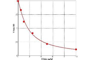 Prepare all Standards before starting assay procedure (Please read Reagents Preparation). It is recommended that all Standards and Samples be added in duplicate to the Microtiter Plate. 1. Secure the desired number of coated wells in the holder then add 50 µL of Standards or Samples to the appropriate well of the antibody pre-coated Microtiter Plate. 2. Add 50 μL of Conjugate to each well. Mix well. Complete mixing in this step is important. Cover and incubate for 1 hour at 37 °C. 3. Wash the Microtiter Plate using one of the specified methods indicated below: 4. Manual Washing: Remove incubation mixture by aspirating contents of the plate into a sink or proper waste container. Using a squirt bottle, fill each well completely with wash solution, then aspirate contents of the plate into a sink or proper waste container. Repeat this procedure four more times for a total of FIVE washes. After final wash, invert plate, and blot dry by hitting plate onto absorbent paper or paper towels until no moisture appears. Note: Hold the sides of the plate frame firmly hen washing the plate to assure that all strips remain securely in frame. 5. Automated Washing: Aspirate all wells, and then wash plate FIVE times using wash solution. Always adjust your washer to aspirate as much liquid as possible and set fill volume at 350 µL/well/wash (range: 350-400 µL). After final wash, invert plate, and blot dry by hitting plate onto absorbent paper or paper towels until no moisture appears. It is recommended that the washer be set for a soaking time of 10 seconds or shaking time of 5 seconds between washes. 6. Add 50 µL Substrate A to each well. 7.Add 50 µL Substrate B to each well. Cover and incubate for 15 minutes at 20-25 °C. (avoid sunlight) 8. Add 50 µL of Stop Solution to each well. Mix well. 9. Read the Optical Density (O.D.) at 450 nm using a microtiter plate reader immediately.