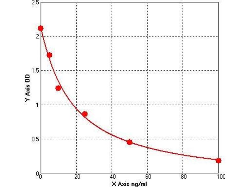 Prepare all Standards before starting assay procedure (Please read Reagents Preparation). It is recommended that all Standards and Samples be added in duplicate to the Microtiter Plate. 1. Secure the desired number of coated wells in the holder then add 50 µL of Standards or Samples to the appropriate well of the antibody pre-coated Microtiter Plate. 2. Add 50 μL of Conjugate to each well. Mix well. Complete mixing in this step is important. Cover and incubate for 1 hour at 37 °C. 3. Wash the Microtiter Plate using one of the specified methods indicated below: 4. Manual Washing: Remove incubation mixture by aspirating contents of the plate into a sink or proper waste container. Using a squirt bottle, fill each well completely with wash solution, then aspirate contents of the plate into a sink or proper waste container. Repeat this procedure four more times for a total of FIVE washes. After final wash, invert plate, and blot dry by hitting plate onto absorbent paper or paper towels until no moisture appears. Note: Hold the sides of the plate frame firmly hen washing the plate to assure that all strips remain securely in frame. 5. Automated Washing: Aspirate all wells, and then wash plate FIVE times using wash solution. Always adjust your washer to aspirate as much liquid as possible and set fill volume at 350 µL/well/wash (range: 350-400 µL). After final wash, invert plate, and blot dry by hitting plate onto absorbent paper or paper towels until no moisture appears. It is recommended that the washer be set for a soaking time of 10 seconds or shaking time of 5 seconds between washes. 6. Add 50 µL Substrate A to each well. 7.Add 50 µL Substrate B to each well. Cover and incubate for 15 minutes at 20-25 °C. (avoid sunlight) 8. Add 50 µL of Stop Solution to each well. Mix well. 9. Read the Optical Density (O.D.) at 450 nm using a microtiter plate reader immediately.