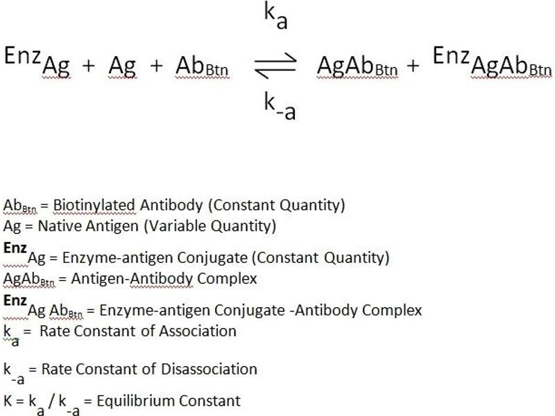 - Competitive Enzyme Immunoassay (TYPE 7): The essential reagents required for an enzyme immunoassay include antibody, enzyme-antigen conjugate and native antigen. Upon mixing biotinylated antibody, enzyme-antigen conjugate and a serum containing the native antigen, a competition reaction results between the native antigen and the enzyme-antigen conjugate for a limited number of antibody binding sites. The enzyme activity in the antibody bound fraction is inversely proportional to the native antigen concentration. By utilizing several different serum references of known antigen concentration, a dose response curve can be generated from which the antigen concentration of an unknown can be ascertained.