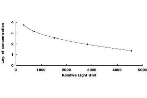 This assay employs the competitive inhibition enzyme immunoassay technique, so there is an inverse correlation between target concentration in the sample and the assay signal intensity. Average the duplicate readings for each standard, control, and samples. Create a standard curve on log-log graph paper, with the log of target concentration on the y-axis and the relative light unit (RLU) value on the x-axis. Draw the best fit straight line through the standard points and it can be determined by regression analysis. Using some plot software, such as curve expert 1.30, is also recommended. If samples have been diluted, the concentration read from the standard curve must be multiplied by the dilution factor.