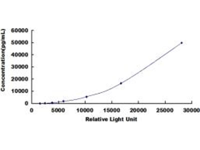 In order to make the calculation easier, we plot the RLU value of the standard (X-axis) against the known concentration of the standard (Y-axis), although concentration is indeed the independent variable while RLU value is the dependent variable. Further, in this part, in order to help the customer perform the assay more visual, we provide the customer with the raw data (not the log of data). However, plotting log of the data to construct the curve will be recommended. The RLU values of the standard curve may vary according to the conditions of assay performance (e.g. operator, pipetting technique, washing technique or temperature effects). This curve is provided for demonstration only. The customers should establish their own standard curve for each test conducted. -