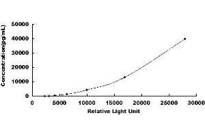 In order to make the calculation easier, we plot the RLU value of the standard (X-axis) against the known concentration of the standard (Y-axis), although concentration is indeed the independent variable while RLU value is the dependent variable. Further, in this part, in order to help the customer perform the assay more visual, we provide the customer with the raw data (not the log of data). However, plotting log of the data to construct the curve will be recommended. The RLU values of the standard curve may vary according to the conditions of assay performance (e.g. operator, pipetting technique, washing technique or temperature effects). This curve is provided for demonstration only. The customers should establish their own standard curve for each test conducted. -