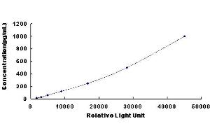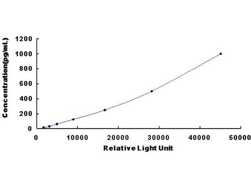 In order to make the calculation easier, we plot the RLU value of the standard (X-axis) against the known concentration of the standard (Y-axis), although concentration is indeed the independent variable while RLU value is the dependent variable. Further, in this part, in order to help the customer perform the assay more visual, we provide the customer with the raw data (not the log of data). However, plotting log of the data to construct the curve will be recommended. The RLU values of the standard curve may vary according to the conditions of assay performance (e.g. operator, pipetting technique, washing technique or temperature effects). This curve is provided for demonstration only. The customers should establish their own standard curve for each test conducted. -