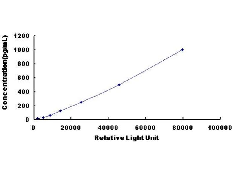 In order to make the calculation easier, we plot the RLU value of the standard (X-axis) against the known concentration of the standard (Y-axis), although concentration is indeed the independent variable while RLU value is the dependent variable. Further, in this part, in order to help the customer perform the assay more visual, we provide the customer with the raw data (not the log of data). However, plotting log of the data to construct the curve will be recommended. The RLU values of the standard curve may vary according to the conditions of assay performance (e.g. operator, pipetting technique, washing technique or temperature effects). This curve is provided for demonstration only. The customers should establish their own standard curve for each test conducted. -