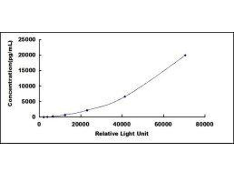 In order to make the calculation easier, we plot the RLU value of the standard (X-axis) against the known concentration of the standard (Y-axis), although concentration is indeed the independent variable while RLU value is the dependent variable. Further, in this part, in order to help the customer perform the assay more visual, we provide the customer with the raw data (not the log of data). However, plotting log of the data to construct the curve will be recommended. The RLU values of the standard curve may vary according to the conditions of assay performance (e.g. operator, pipetting technique, washing technique or temperature effects). This curve is provided for demonstration only. The customers should establish their own standard curve for each test conducted. -