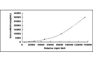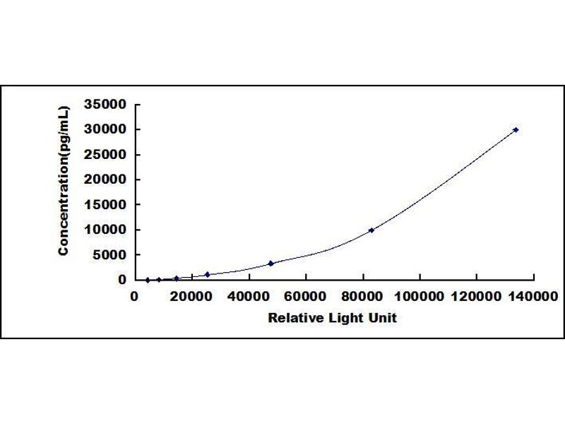 In order to make the calculation easier, we plot the RLU value of the standard (X-axis) against the known concentration of the standard (Y-axis), although concentration is indeed the independent variable while RLU value is the dependent variable. Further, in this part, in order to help the customer perform the assay more visual, we provide the customer with the raw data (not the log of data). However, plotting log of the data to construct the curve will be recommended. The RLU values of the standard curve may vary according to the conditions of assay performance (e.g. operator, pipetting technique, washing technique or temperature effects). This curve is provided for demonstration only. The customers should establish their own standard curve for each test conducted. -